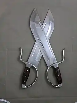 Le couteau papillon est généralement manié par paire, mais des clichés anciens montrent aussi un usage à un seul couteau, complété d'un bouclier[5]. Dans le même esprit, ils sont généralement placés côte à côte dans le même fourreau. Le couteau a aussi une garde en D pour protéger les mains de l'utilisateur. La garde est généralement prolongée par un crochet.