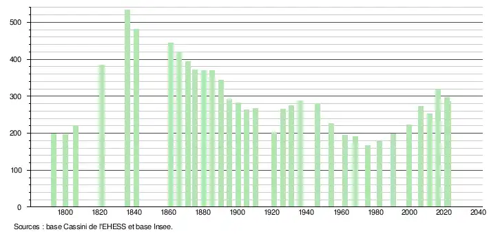 L'évolution du nombre d'habitants est connue à travers les recensements de la population effectués dans la commune depuis 1793. Pour les communes de moins de 10 000 habitants, une enquête de recensement portant sur toute la population est réalisée tous les cinq ans, les populations de référence des années intermédiaires étant quant à elles estimées par interpolation ou extrapolation[18]. Pour la commune, le premier recensement exhaustif entrant dans le cadre du nouveau dispositif a été réalisé en 2006[19].