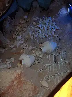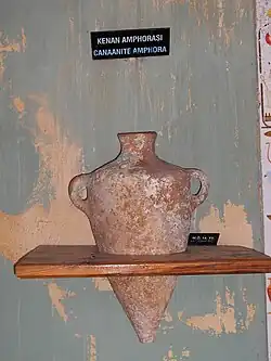 - 150 jarres cananéennes de trois tailles différentes, des flasques et des jarres profondes (pithoi) : leurs contenus révèlent des restes de résine de térébinthe, de raisins, de figues, de grenades, d'olives, et d'épices comme la coriandre et du sumac ;