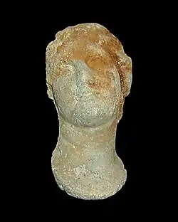 D'autres éléments sculptés sont en très mauvais état, ce qui rend plus complexe leur identification et leur interprétation. Une représentation d'un jeune homme, peut-être un Oreste d'un groupe Oreste-Électre, est parvenu incomplet et avec une variation dans le traitement des visages et des coiffures par rapport aux représentations classiques[109]. Deux torses masculins dont l'un représentait sans doute un adolescent vêtu d'une chlamyde, ont été identifiés à des modèles du Ve siècle av. J.-C.[110].