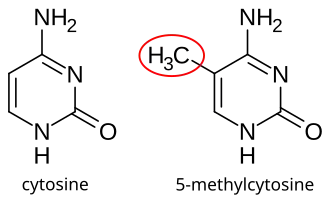 La méthylation de l'ADN est la modification épigénétique la plus étudiée par les chercheurs[17]. Ce processus consiste en l'ajout d'un groupement méthyle (CH3) à des nucléotides spécifiques sur le génome[18]. Cette modification sur les nucléotides du génome est faite par des enzymes spécifiques appelées ADN-méthyltransférases. Chez les différents taxons, la méthylation de l'ADN comporte de nombreuses différences, soit au niveau du type de nucléotides méthylés, adénine ou cytosine, ou à quelle position moléculaire le groupe méthyle s'ajoutera[18]. En effet, chez Eubacteria et Archaea, la méthylation se produit sur l'adénine alors que chez les Eukaryota, la seule modification de l'ADN convaincante est la méthylation qui se produit en position C5 de la cytosine. Par contre, la méthylation en position C5 de la cytosine est commune dans tous les domaines de vie[18].