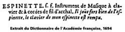 « Le clavecin est une espèce d'espinette dans une autre disposition du clavier. Ce nom a été donné, à cause de ces petites pointes de plumes qui tirent le son des cordes, qui ressemblent à des épines. »