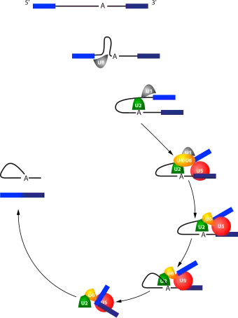 Le processus d'épissage est un mécanisme dynamique qui suit une succession précise d'évènements au cours de laquelle les différentes petites ribonucléoprotéines nucléaires s'assemblent et se désassemblent du splicéosome. La séquence est la suivante :