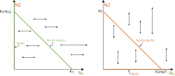 Le comportement asymptotique du modèle à deux espèces peut être facilement exploré en faisant une analyse des isoclines[2] : une analyse graphique de la position des isoclines-zéro (courbes le long desquelles la croissance d'une espèce est nulle) dans l'espace des phases qui est ici le plan .