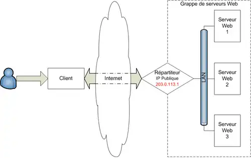 - les grappes de serveurs Web virtuelle, où une seule adresse IP est visible par le client mais sans élément central