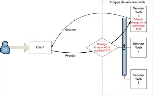 Par contre, la réponse directe du serveur au client nécessite des modifications au niveau du système d'exploitation du serveur et du répartiteur. De plus, la gestion des requêtes et des réponses permet de bénéficier de fonctionnalités de Cache web prises en charge directement par le répartiteur[43].