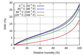 La teneur en humidité du bois dépend de l'humidité relative, et de la température de l'air où il se trouve. Si le bois reste assez longtemps dans une atmosphère pour lequel l'humidité relative et la température restent constantes, la teneur en humidité deviendra également constante à la valeur connue sous le nom d'équilibre hygrométrique (EMC). Ainsi chaque combinaison d'humidité relative et de température a une EMC associée. L'EMC augmente avec une augmentation de l'humidité relative, et avec une température décroissante[7].