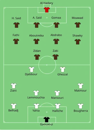 | El Hadary - Al Muhamadi - El Sakka - Saïd - Fathi - Moawad - Homos (Barakat | Équipes | Gaouaoui - Bougherra - Halliche (Laïfaoui | ||||||||||||||||||||||