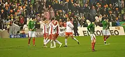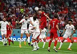 La même année, l'équipe dispute la phase qualificative de la coupe du monde 2006, et réussit à battre la Guinée (défaite 1-2 et victoire 2-0)[203],[204], le Kenya (deux victoires 1-0 et 2-0)[205],[206], le Malawi (nul 2-2 et victoire 7-0)[207],[208], le Botswana (deux victoires 4-1 et 3-1)[209],[210] et le Maroc, après un match nul à l'extérieur[211] et un match nul (2-2) lors de la dernière journée au stade du 7-Novembre à Radès devant 60 000 spectateurs[212], lui permettant de se qualifier pour la coupe du monde pour la quatrième fois de son histoire et la troisième fois consécutive[213].