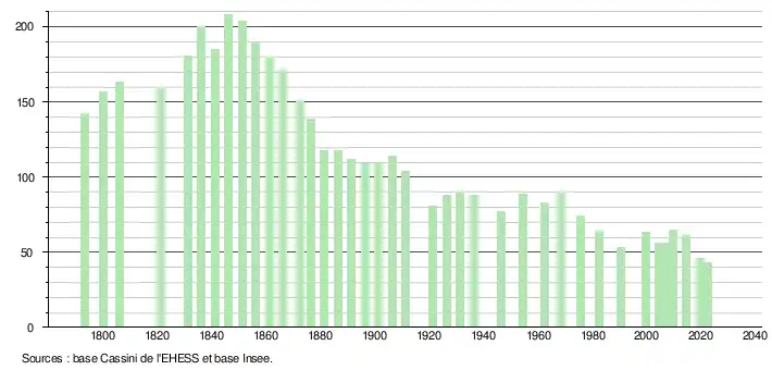 L'évolution du nombre d'habitants est connue à travers les recensements de la population effectués dans la commune depuis 1793. Pour les communes de moins de 10 000 habitants, une enquête de recensement portant sur toute la population est réalisée tous les cinq ans, les populations de référence des années intermédiaires étant quant à elles estimées par interpolation ou extrapolation[19]. Pour la commune, le premier recensement exhaustif entrant dans le cadre du nouveau dispositif a été réalisé en 2004[20].