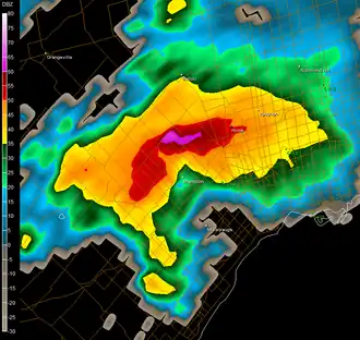 Le supercellule venant de Milverton a maintenu toutes les caractéristiques d'un orage producteur de tornades alors qu'elle approchait de la ville de Toronto. La détection sur les radars météorologiques montrait un écho en crochet, une voûte d'échos faibles et un mésocyclone fort, mais le tourbillon a quitté le sol après la deuxième tornade[3]. La cellule a par la suite effectué un changement de comportement passant de tornadique à productrice de pluie torrentielle. Ainsi à Thornhill (43° 48′ 58″ N, 79° 25′ 28″ O), au nord de Toronto, le pluviomètre d'une observatrice volontaire enregistra 175 mm de pluie en moins d'une heure[1].