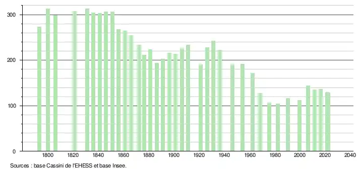 L'évolution du nombre d'habitants est connue à travers les recensements de la population effectués dans la commune depuis 1793. Pour les communes de moins de 10 000 habitants, une enquête de recensement portant sur toute la population est réalisée tous les cinq ans, les populations de référence des années intermédiaires étant quant à elles estimées par interpolation ou extrapolation[19]. Pour la commune, le premier recensement exhaustif entrant dans le cadre du nouveau dispositif a été réalisé en 2006[20].