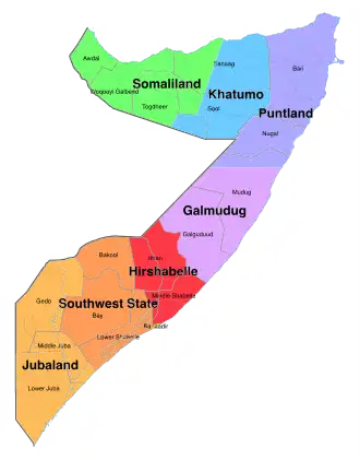 Au moment de la promulgation de la constitution, seul le Pount est déjà constitué en État fédéré, et ce, à partir de deux régions et demi. En 2016, les autres régions, à l'exception de la région de Banaadir, se sont regroupées en États[2]. Sont donc créés les États de Jubaland à partir de trois régions, du Sud-Ouest à partir de trois régions, de Galmudug à partir d'une région et demi et d'Hirshabelle à partir de deux régions. Ces États ont une organisation variable et ne jouissent pas d'une autorité équivalente sur leur territoire respectif[5]. Le Somaliland formé à partir de cinq régions est toujours considéré comme l'un de ses États par le gouvernement somalien.