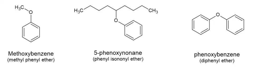 Par exemple, l'anisole (nom trivial) est l'éther de phénol formé par condensation du méthanol (CH3 OH) et du phénol (C6H5OH), pour une formule semi-développée globale C6H5-O-CH3 (ou Ph-O-CH3) ; étant donné que le groupe méthyle attaché à l'oxygène est plus petit que le cycle benzénique (un atome de carbone contre six), le benzène est prioritaire, est le nom systématique de la molécule est donc « méthoxybenzène ».