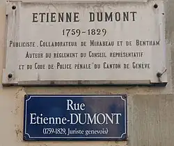 - Le , à Genève, la « rue des Belles-Filles » est renommée « rue Étienne Dumont », dans cette rue est posée une plaque en marbre où il est gravé : « Étienne Dumont - Publiciste, Collaborateur de Mirabeau et de Bentham Auteur d'un Règlement du Conseil représentatif et du Code de Police pénale du Canton de Genève »[7].