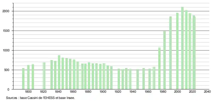 L'évolution du nombre d'habitants est connue à travers les recensements de la population effectués dans la commune depuis 1793. Pour les communes de moins de 10 000 habitants, une enquête de recensement portant sur toute la population est réalisée tous les cinq ans, les populations de référence des années intermédiaires étant quant à elles estimées par interpolation ou extrapolation[19]. Pour la commune, le premier recensement exhaustif entrant dans le cadre du nouveau dispositif a été réalisé en 2006[20].