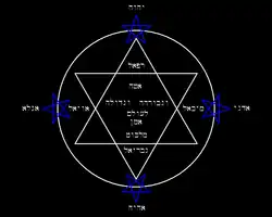 Représentation graphique de l'étoile kabbalistique, les noms de Dieu et les noms des quatre anges en hébreu.