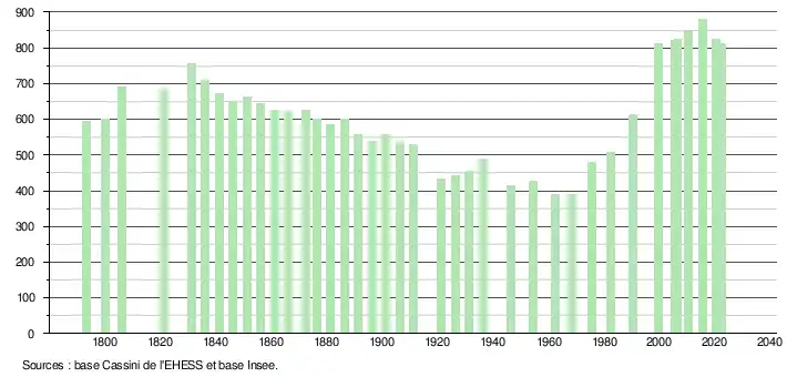 L'évolution du nombre d'habitants est connue à travers les recensements de la population effectués dans la commune depuis 1793. Pour les communes de moins de 10 000 habitants, une enquête de recensement portant sur toute la population est réalisée tous les cinq ans, les populations de référence des années intermédiaires étant quant à elles estimées par interpolation ou extrapolation[39]. Pour la commune, le premier recensement exhaustif entrant dans le cadre du nouveau dispositif a été réalisé en 2005[40].