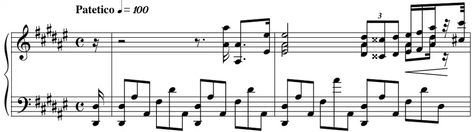 Elle est en ré dièse mineur (six dièses à la clé), de mesure 4/4 ou C, mesure assez rarement utilisée par le compositeur, contrairement à Rachmaninov qui l'utilise dans un nombre considérable de pièces. Le tempo donné se situe sur une fourchette de 100 à 112 à la noire avec comme indication Patetico (d'où le nom qu'on lui donne parfois, la Pathétique).