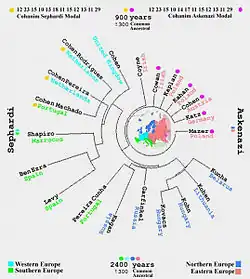 Les premiers à avoir montré l'existence d'un patrimoine génétique paternel commun entre les Juifs séfarades et ashkénazes sont Gérard Lucotte et Fabrice David[8] en 1992[9],[10]. En 1993, A. S. Santachiara Benerecetti[11] et ses collègues ont suggéré l'origine proche-orientale de lignées paternelles des Juifs[12]. En 2000, Michael F. Hammer[13] et ses collègues ont réalisé une étude sur plus de mille hommes qui a définitivement établi qu'une partie du « patrimoine génétique paternel des communautés juives d'Europe, d'Afrique du Nord et du Moyen-Orient était issue d'une population ancestrale moyen-orientale commune » et suggérait que « la plupart des communautés juives étaient restées relativement isolées des communautés non juives voisines durant leur vie en diaspora »[1].
