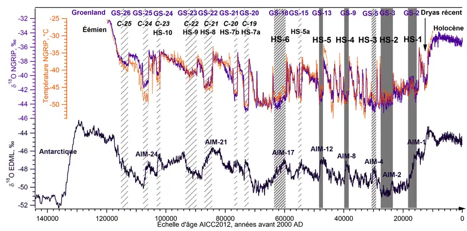 - ↑ (en) NGRIP members, « High-resolution record of Northern Hemisphere climate extending into the last interglacial period », Nature, vol. 431, , p. 147-151 (DOI 10.1038/nature02805, lire en ligne).