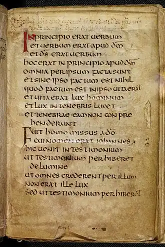 La tombe de Cuthbert est à nouveau ouverte en 1104, au début de l'épiscopat de Rainulf Flambard. Les reliques du saint sont déplacées derrière le grand autel de la cathédrale normande, alors en cours de construction. Le plus ancien récit connu de cette translation, rédigé par un moine de la cathédrale, rapporte qu'« un livre des Évangiles » a été découvert lors de l'ouverture du cercueil[52]. Le récit rapporte également que le jour de la translation, l'évêque Rainulf présente à la congrégation « un évangile de saint Jean, parfaitement conservé par miracle[53] ». Ce récit est confirmé par une inscription sur le folio 1 recto du manuscrit, « dans une écriture modeste, apparemment de la fin du douzième siècle », qui signale sa découverte lors de la translation[54].