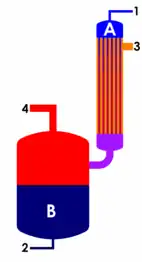 Ici (voir aussi ci-dessus) le liquide circule continuellement entre échangeur et chambre de séparation de phases ; la circulation est engendrée soit par un effet thermosiphon - prenant avantage du différentiel de densité entre les liquides chaud et froid, soit par l'entrainement dû au changement d'état physique se développant à l'intérieur des tubes — ceux-ci sont nommés à circulation naturelle — ou enfin par l'action d'une pompe, ayant une hauteur manométrique suffisante pour compenser la perte de charge dans le circuit, dans les modèles à circulation forcée.