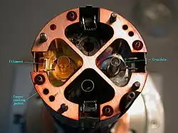 - dans la méthode thermique, le matériel à déposer est placé dans un creuset qui est chauffé radialement par un filament électrique ; il est possible aussi que le filament lui-même soit la source ;