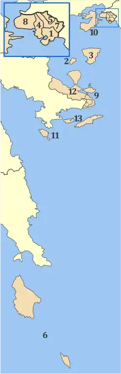Dans le cadre de la réforme gouvernementale de 2011, le Programme Kallikratis, le district régional des îles est créé sur une partie de l'ancienne nomarchie du Pirée. Il comprend 8 municipalités qui sont[2] (numérotées selon la carte dans l'infobox) :