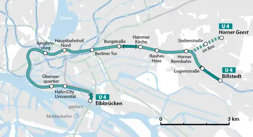 La première cérémonie d'inauguration des travaux a lieu le par le premier bourgmestre Ole von Beust pour ouvrir HafenCity avec une nouvelle ligne de métro. Les premiers travaux de la station de métro Überseequartier débutent cependant début 2007 selon la méthode de la tranchée couverte. Le tunnelier VERA atteint la station Jungfernstieg depuis HafenCity pour le premier tunnel le et le deuxième le . Les travaux intérieurs de la station de métro commencent à l'été 2010.