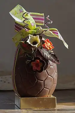 À l'œuf est associée la poule, qu'on trouve maintenant sous forme de statuette en chocolat. Les confiseries peuvent aussi représenter d'autres sujets, comme des lapins.
