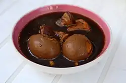 Œufs marinés au soja, anglais soy egg, japonais 味付け玉子 (ajitsuke tamago) ajitsuke assaisonné et tamago œuf ou 味玉 (ajitama) aji goût et tama boule, sont des œufs mollets marinés dans de la sauce soja, du sucre, du mirin ou du vin de riz et autres aromates[63],[58],[64]. L'œuf se teinte dans la marinade et donne l'impression d'être toujours dans une coquille, il s'imprègne de saveurs, celle d'anis est appréciée[24].