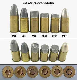 - Chargé à la cordite, il devient .455 Webley Mk II, .455 Revolver Mk II, .455 Colt Mk II ou .455 Eley.