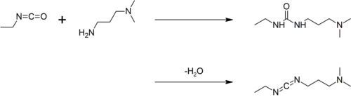 Le 1-éthyl-3-(3-diméthylaminopropyl)carbodiimide peut être préparé par couplage de l'isocyanate d'éthyle avec la N,N-diméthylpropane-1,3-diamine pour donner une urée (carbamide), suivi d'une déshydratation[3] :