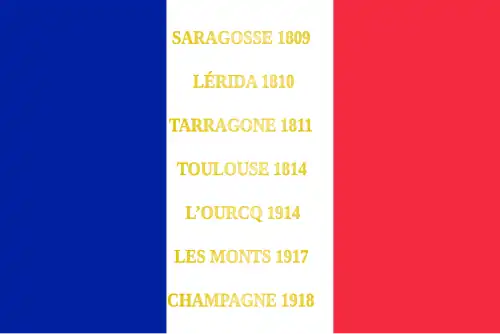 Les noms des batailles s'inscrivent en lettres d'or sur le drapeau[1] :