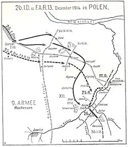 Fin novembre, le corps d'armée est transféré sur le front de l'Est, dans la section de la 9e armée (Mackensen) à Lowicz, dans le nord de la Pologne. Le corps Fabeck (26e division et 25e division de réserve avec le 132e régiment d'artillerie de campagne wurtembergeois subordonné) a avancé sur la Bzura à Kozlow en décembre 1914.