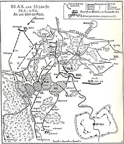 Le 13e corps d'armée atteint la ligne Dombras-Merles-Mangiennes le 26 août. Après avoir traversé la Meuse fin août, le corps combat début septembre dans la bataille entre Varennes-Montfaucon et progresse à l'ouest de Verdun en Argonne. Le 9 septembre, le corps mène une attaque de nuit au sud de Sommaisne, mais doit reculer suite au repli allemand sur la Marne.