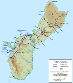 En , le commandant de la 29e division, le lieutenant-général Takeshi Takashina, débarque à Guam et assume le contrôle sur toutes les unités militaires pour la défense de l'île[13]. En anticipation d'une imminente invasion de Guam par les Américains, le corps principal du 18e régiment est basé dans les montagnes, et chaque compagnie est déployée pour couvrir les points de débarquement possibles[2]. Le , l'opération de débarquement américaine commence[17]. Malgré une féroce résistance, les forces américaines prennent le contrôle de deux têtes de pont sur la plage à la nuit tombée tandis que les défenseurs japonais tentent de contre-attaquer et d'attaquer les positions américaines avec des mitrailleuses, de l'artillerie, et des mortiers[18].