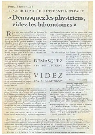 Démasquez les physiciens, videz les laboratoires, tract signé collectivement du Comité de lutte anti-nucléaire[1].