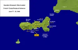 À 04h00, le , le 1er corps d'armée se lança à l'assaut de l'île d'Elbe, l'opération portant le nom d'opération Brassard. Les forces françaises étaient composées de la 9e division d'infanterie coloniale (9e DIC), de deux bataillons de commandos français (les Commandos d'Afrique et les Commandos de Choc), d'un bataillon et d'une batterie supplémentaire provenant du Régiment d'Artillerie Coloniale du Maroc (RACM), et du 2e Groupe de Tabors Marocains (2e GTM), en plus de 48 hommes des commandos "A" et "O" de la Royal Navy[18]. Les unités françaises « de choc » (combattants armés légèrement, qui avaient la mission d'opérer derrière les lignes ennemies) débarquèrent en de multiples points avant la principale force de débarquement, et neutralisèrent les batteries d'artillerie côtières. Débarqués dans le golfe de Campo sur la côte Sud, les Français rencontrèrent tout d'abord quelques difficultés à cause des fortifications allemandes et du caractère extrêmement accidenté du terrain qui entourait la zone de débarquement. Se rabattant sur un plan de secours, la plage de débarquement fut déplacée vers l'est, près de Nercio, et là, les troupes de la 9e division d'infanterie coloniale purent établir une tête de pont viable. En deux heures, les commandos atteignirent le sommet de la crête du mont Tambone surplombant l'aire de débarquement. Les commandos de la Royal Navy abordèrent et capturèrent le bateau anti-aérien Köln et débarquèrent également pour guider les autres troupes vers les plages, mais une explosion massive de charge de démolition allemande en tua 38. Portoferraio fut prise par la 9e Division le , et l'île fut assurée les jours suivants. Les combats dans les collines entre les Allemands et l'infanterie coloniale sénégalaise furent vicieux, car les sénégalais employaient des lance-flammes pour « nettoyer » les troupes allemandes enterrées dans les tranchées[19].