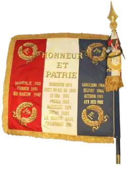 - ↑ Décision no 2350/SGA/DPMA/SHD/DAT du 14 septembre 2007 relative aux inscriptions de noms de batailles sur les drapeaux et étendards des corps de troupe de l'armée de terre, du service de santé des armées et du service des essences des armées, Bulletin officiel des armées, no 27, 9 novembre 2007