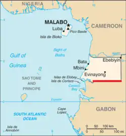 | Gabon / Guinée équatoriale | Frontière | 1° 00′ N, 10° 00′ E | 1° 00′ N, 11° 20′ E | 148 |