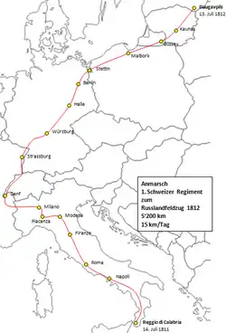 En 1812, à la lumière des changements intervenus l'année précédente, le 1er suisse est restructuré en deux bataillons d'active, pour un effectif total de 2 103 hommes. Quoique pourvu à cette époque de seulement deux bataillons, il est le plus important des régiments suisses, suivi de près par le 2e régiment avec ses 1 822 hommes répartis en trois bataillons. Au commencement de la campagne de Russie, tous les régiments suisses sont réunis pour la première fois au sein du 2e corps d'armée du maréchal Oudinot. Les 1er et 2e suisses servent à la brigade du général Jacques Lazare Savettier de Candras, laquelle fait partie de la division du général Merle avec les brigades Coutard (3e suisse et 128e de ligne) et Amey (4e suisse et 3e régiment provisoire croate)[8].