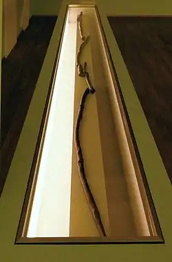 - 125 000 ans AP : lance en bois de Lehringen, en Basse-Saxe (Allemagne), fichée dans un squelette d'éléphant antique[31].