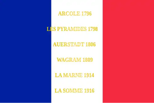 - ↑ Décision no 12350/SGA/DPMA/SHD/DAT du 14 septembre 2007 relative aux inscriptions de noms de batailles sur les drapeaux et étendards des corps de troupe de l'armée de terre, du service de santé des armées et du service des essences des armées, Bulletin officiel des armées, no 27, 9 novembre 2007