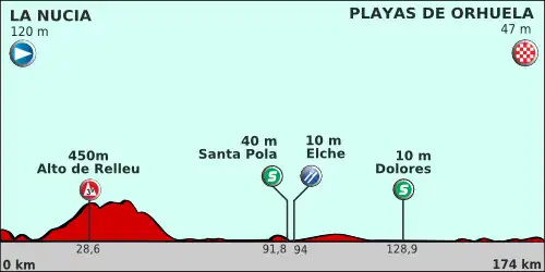 L'étape est essentiellement plate, à l'exception notable de l'Alto de Relleu, col de troisième catégorie dans la province d'Alicante.