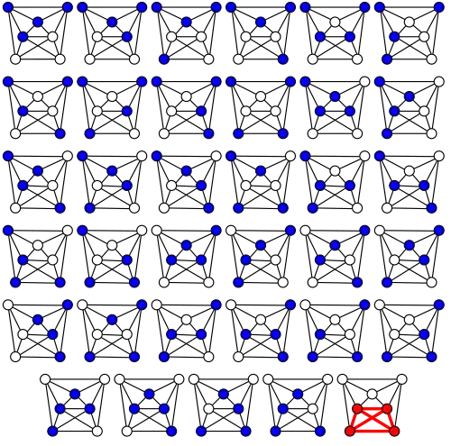 Le problème algorithmique de trouver une clique maximum dans un graphe aléatoire tiré du modèle Erdős – Rényi (dans lequel chaque arête apparaît avec une probabilité 1/2, indépendamment des autres arêtes) a été suggéré par Karp (1976). Étant donné que la clique maximum dans un graphe aléatoire a une taille logarithmique avec une probabilité élevée, elle peut souvent être trouvée par une recherche par force brute dans le temps . Il s'agit d'une limite temporelle quasi polynomiale[45]. Bien que le nombre de cliques de ces graphes soit généralement très proche de 2 log2n, des algorithmes gloutons simples ainsi que des techniques d'approximation aléatoire plus sophistiquées ne trouvent que des cliques de taille log2n, deux fois moins grandes. Le nombre de cliques maximales dans de tels graphes est avec une probabilité élevée exponentielle en log2n, ce qui empêche les méthodes qui répertorient toutes les cliques maximales de s'exécuter en temps polynomial[46]. En raison de la difficulté de ce problème, plusieurs auteurs ont étudié le problème de la clique plantée, le problème de la clique sur des graphes aléatoires qui ont été augmentés en ajoutant de grandes cliques[47]. Alors que les méthodes spectrales[48] et la programmation semi-définie[49] peuvent détecter les cliques cachées de taille , aucun algorithme en temps polynomial n'est actuellement connu pour détecter celles de taille (exprimées en utilisant la notation o)[50].