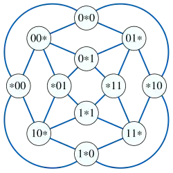 Un graphe des relations de compatibilité pour des échantillons de 2 bits sur des preuves de 3 bits. Chaque clique maximale dans ce graphe représente toutes les manières d’échantillonner 3 bits. La preuve d'inaproximabilité du problème de la clique utilise des sous-graphes de graphes construits de même manière pour un plus grand nombre de bits.