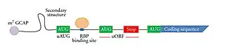 Le 5′ UTR peut également être complètement absent, dans le cas des ARNm sans leader . Les ribosomes des trois domaines de la vie acceptent et traduisent ces ARNm[6]. De telles séquences se retrouvent naturellement dans les trois domaines de la vie. Les humains possèdent de nombreux gènes liés à la pression sous un leader de 2–3 nucléotides. Les mammifères ont également d'autres types de leaders ultra-courts comme la séquence TISU[7].