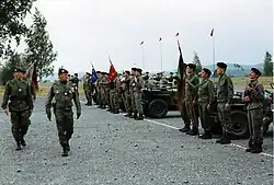 les 1re, 2e, 3e escadrons du 5ehussards, Laon-Couvron, septembre 1991, passés en revue par le colonel d'Evry reconstitution à Coblence (quartier Dejean) du 5ehussards sous les ordres du colonel Louis Bernard. Le régiment est équipé de M24 Chaffee